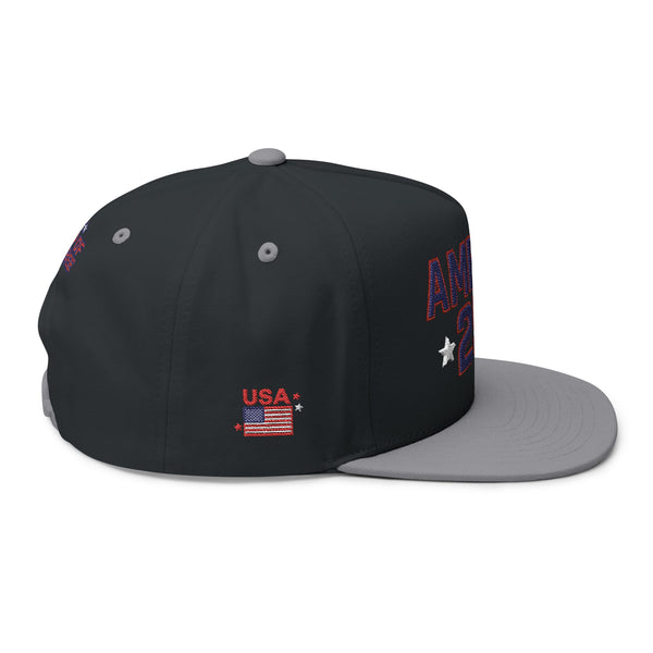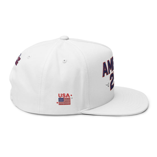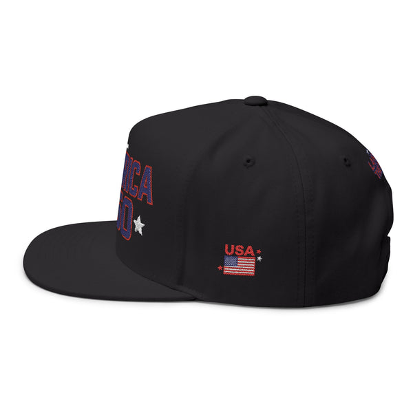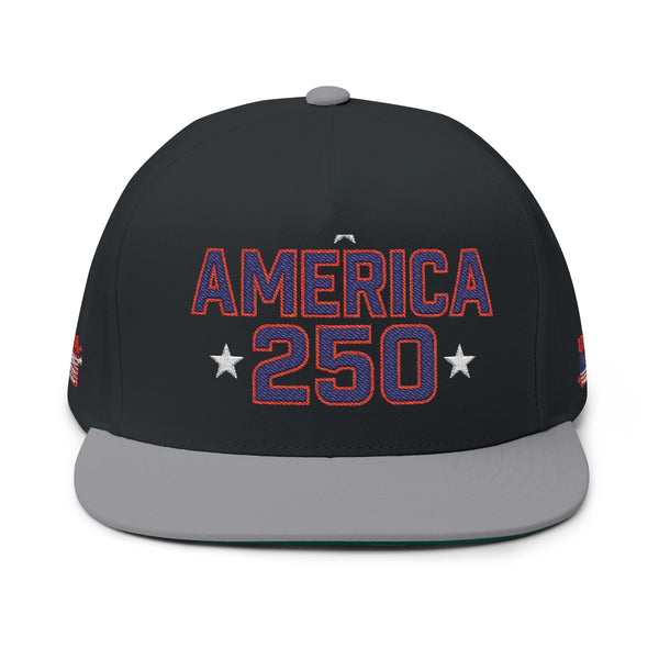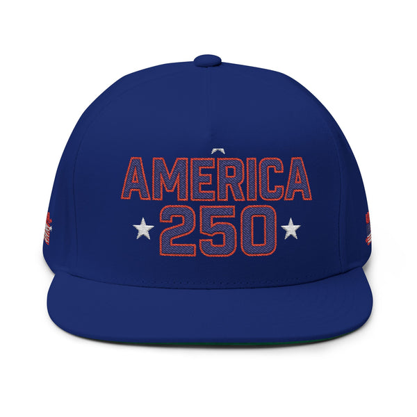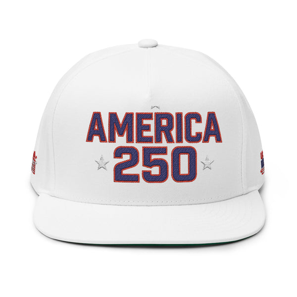 This flat bill cap brings bold, patriotic energy to streetwear. The high-profile, five-panel silhouette holds its shape and showcases detailed embroidery—’AMERICA 250’ on the front with small star accents, and a compact embroidered slogan above the snapback. The crisp white twill and contrasting green undervisor give vintage sportswear vibes, while the structured build and sewn eyelets keep it breathable and sturdy.