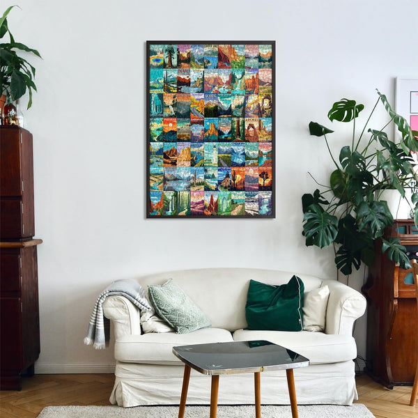 1000-Piece USA National Parks Jigsaw Puzzle (27.5 x 19.7 in / 70 x 50 cm) featuring 63 iconic parks like Rocky Mountain and Olympic National Park. Includes a premium gift box and double-sided poster with landscape guide and US parks map. Made from durable 3-layer cardboard with precision-cut pieces, non-toxic inks, no glare, and no puzzle dust. Perfect travel gift, home décor, and wall art for nature lovers. Missing piece support included.