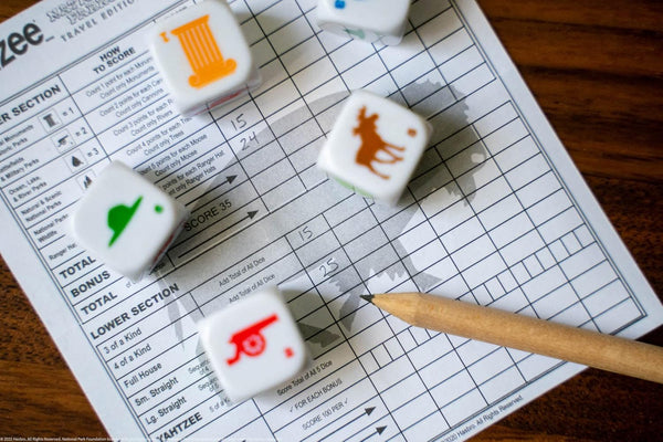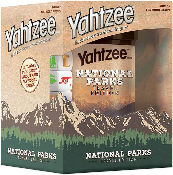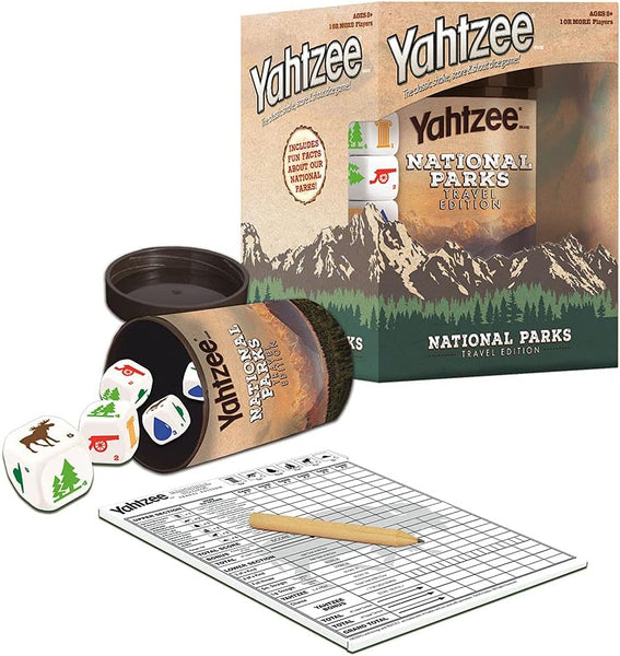YAHTZEE: National Parks Edition is the classic dice game with a National Parks twist. Features custom dice with outdoor icons like deer, tent, canoe, hiker, pine trees, and binoculars, plus a themed dice cup. Perfect travel game for families, ages 8+, 1+ players, 30+ minute playtime. Celebrate America’s national parks while supporting the National Park Foundation with every purchase.