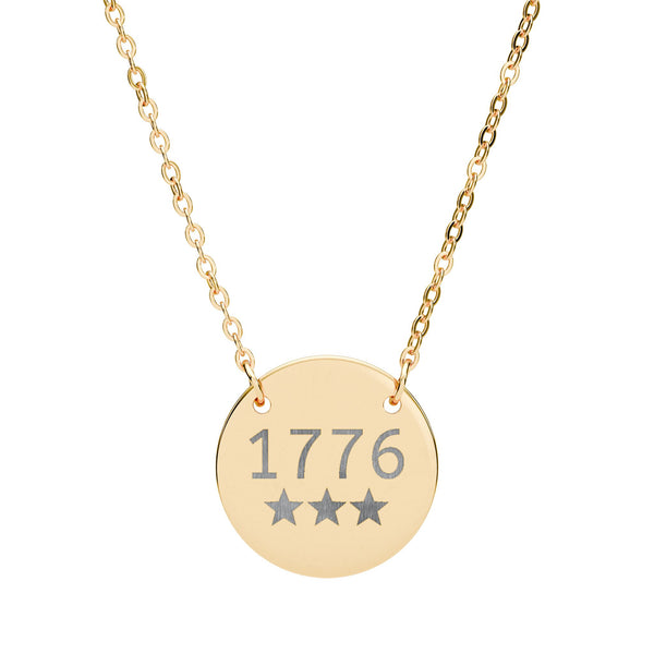 A simple, elegant circle pendant engraved with “1776” and three stars — quiet, timeless symbolism for those who carry history close. The pendant’s smooth, mirror-like surface and laser-etched detail give it a refined, slightly vintage feel. Worn on a delicate chain, it sits just below the collarbone as a subtle statement piece that pairs effortlessly with casual tees or dressed-up layers.