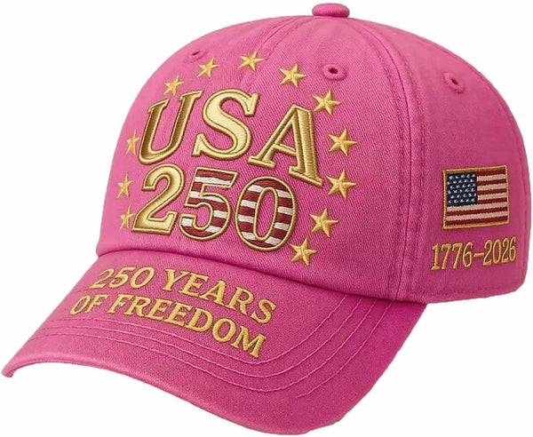 Celebrate America’s historic 250th Anniversary in style with this Pink Women’s USA 250 Hat. Designed with bold patriotic embroidery and a comfortable classic baseball cap fit, this hat is a fun and fashionable way to honor the United States Semiquincentennial (1776–2026).