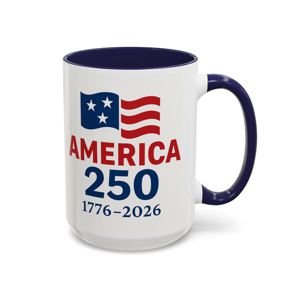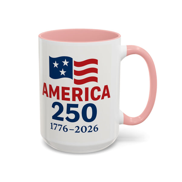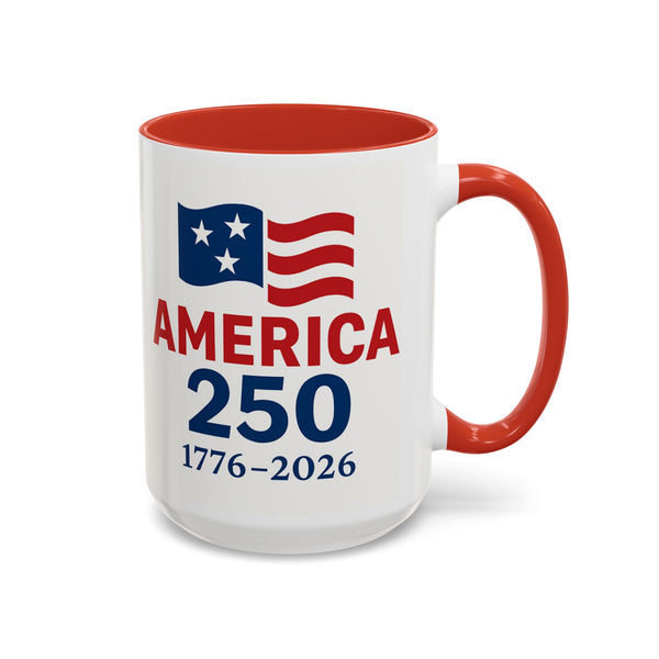Celebrate a milestone with a bright, bold mug made for mornings, meetings, and moments that matter. This ceramic mug pairs a crisp white exterior with a colored interior and handle for eye-catching contrast. The patriotic design — waving flag icon, strong red and blue type, and the dates 1776–2026.
