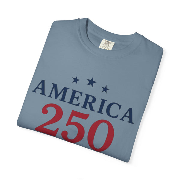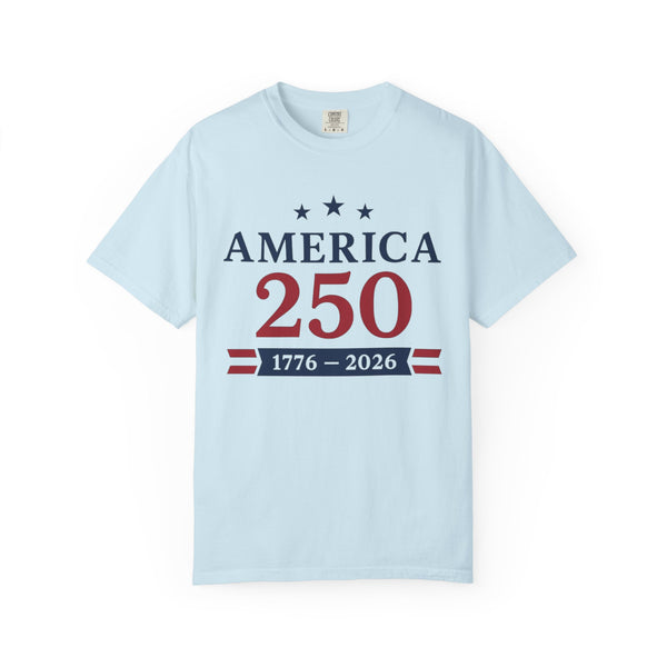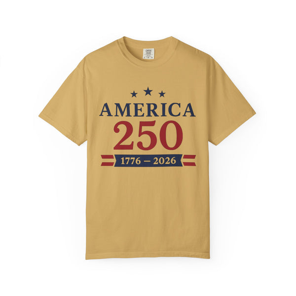 Celebrate a milestone with a soft, lived-in tee that honors the spirit of America. This relaxed-fit garment-dyed shirt carries a vintage-inspired flag graphic and bold “America 250 — 1776–2026” print across the chest.
