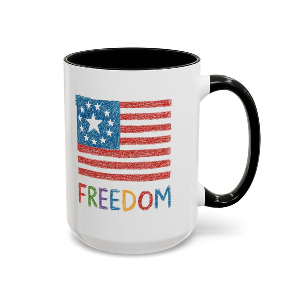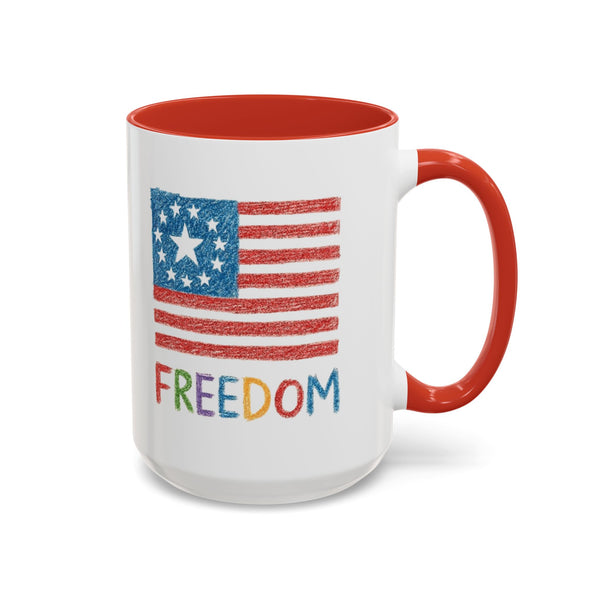 Celebrate a milestone with a bright, bold mug made for mornings, meetings, and moments that matter. This ceramic mug pairs a crisp white exterior with a colored interior and handle for eye-catching contrast. The patriotic design — Kids Crayon Drawing America 250 Coffee Mug