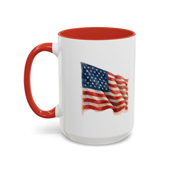 Celebrate a milestone with a bright, bold mug made for mornings, meetings, and moments that matter. This ceramic mug pairs a crisp white exterior with a colored interior and handle for eye-catching contrast. The patriotic design — waving flag icon, strong red and blue type.